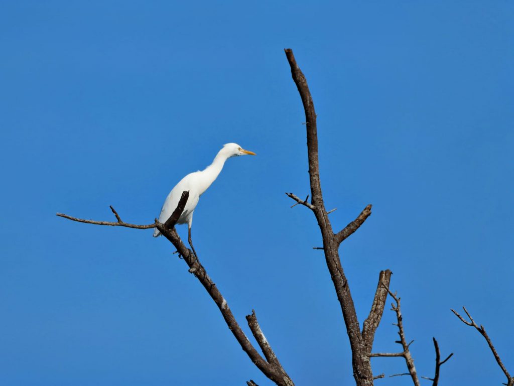 Cattle Egret – A white bird often seen near cattle or fields, feeding on insects stirred up by grazing animals.